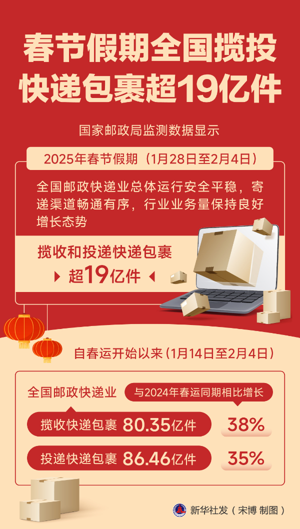 快递包裹量的良好增长,进一步凸显邮政快递业保通保畅、递送温暖的积极作用。特别是自春运开始以来(1月14日至2月4日),全国邮政快递业揽收快递包裹80.35亿件,与2024年春运同期相比增长38%;投递快递包裹86.46亿件,与2024年春运同期相比增长35%。一件件包裹不仅承载了温情与祝福,也激发了消费市场的活力与潜力。
