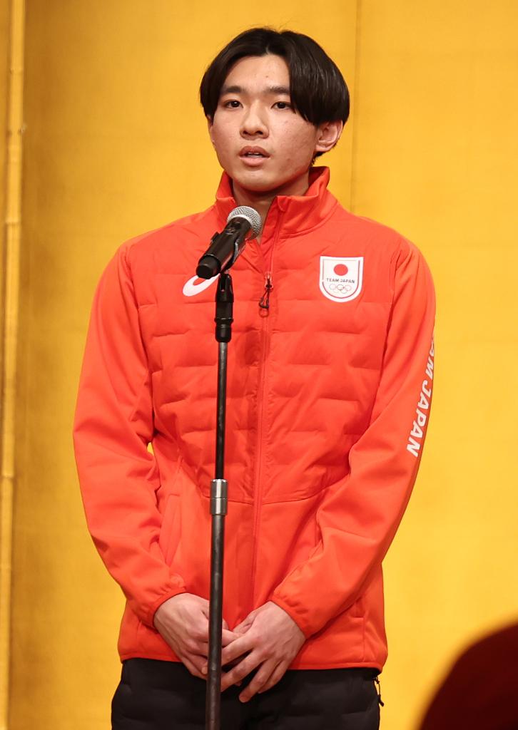 2月4日,日本体育代表团旗手之一、冰壶运动员渡边阳纪在大会上发言。当日,哈尔滨亚冬会日本体育代表团成立仪式在东京举行。新华社记者 贾浩成 摄