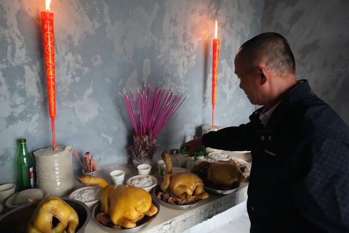 除夕这天早晨,岛上的渔民们一同到兄弟公庙摆上贡品。一沓草纸,拭净案台。点上香烛两支、供香一把。香案上整齐摆上四只煮好的鸡、三挂煮熟的猪肉、七碗米饭、两瓶白酒带五个酒杯、四盘水果。