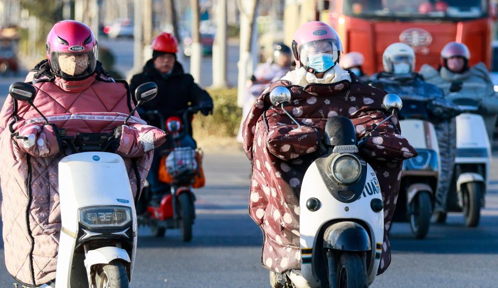 2月8日,在江苏省淮安市淮安区,市民骑车出行。受寒潮影响,多地迎来大风降温天气。新华社发(赵启瑞摄)