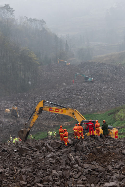 9时,记者来到滑坡救援现场,山区雨雾蒙蒙,十分阴冷。在滑坡带底部,已有多台挖掘机在作业,巨大的轰鸣声响彻山谷。现场被划分为十个搜救网格,救援人员全力开展搜寻。
