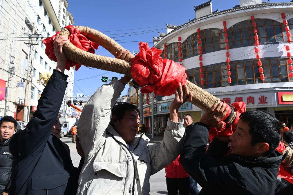 2月10日,在临潭县城关镇西大街,当地群众抬起万人扯绳活动的绳头。新华社记者 范培珅 摄