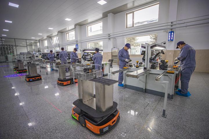 精细的检修在重载制动检修中心由人工完成,需要什么工具和零件,在工位上发送一个指令,就有小机器人沿着AGV通道送到手边。