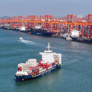 一艘装载出口新能源汽车零配件集装箱的货轮驶离广西钦州港(2024年10月24日摄,无人机照片)。新华社记者张爱林摄