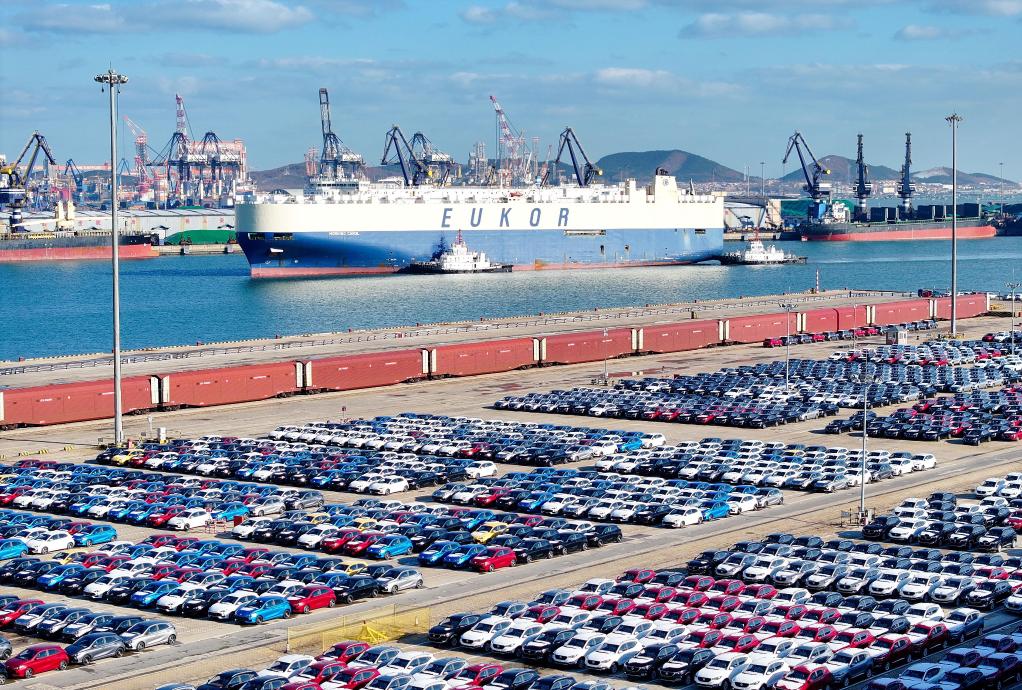 一艘商品车运输船靠泊山东港口烟台港(2024年12月8日摄,无人机照片)。新华社发(张进刚摄)