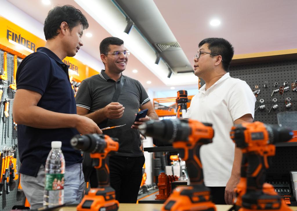 义乌发现者进出口有限公司销售部经理艾彬(右)向来自突尼斯的客户介绍钻头(2024年10月9日摄)。新华社记者翁忻旸摄