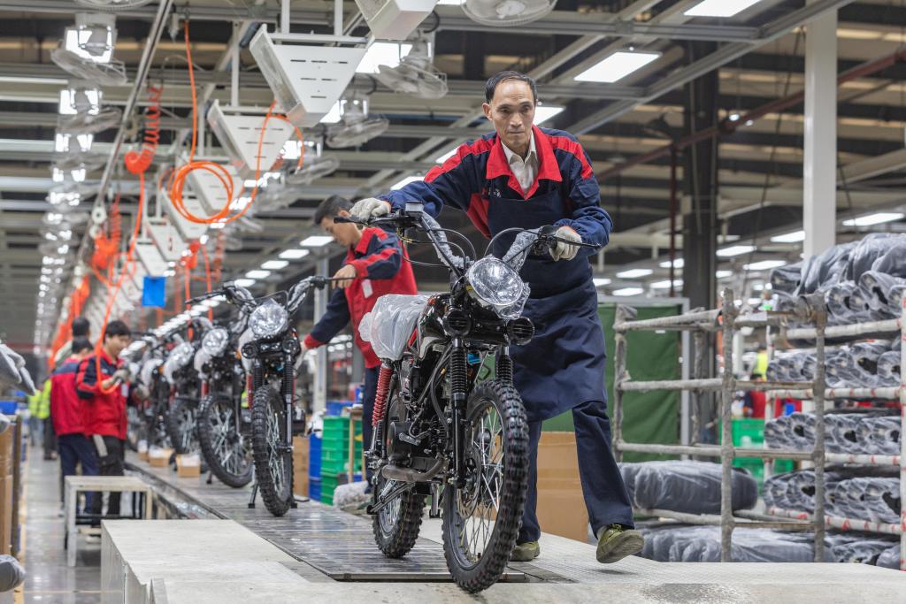 在位于重庆高新区的重庆鑫源摩托车股份有限公司工厂内,工作人员将组装好准备出口拉美国家的摩托车推下生产线(2024年11月13日摄)。新华社记者黄伟摄