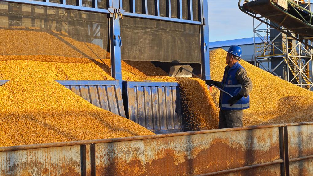 在内蒙古扎兰屯市,工人对玉米进行收储。(新华社发)