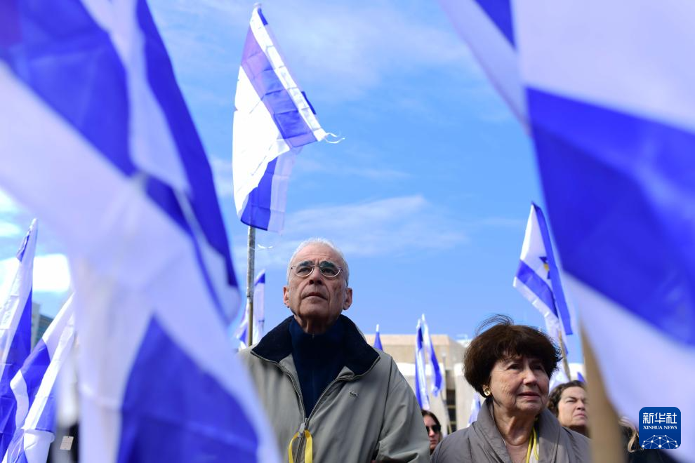 2月20日,在以色列特拉维夫一处广场,人们通过屏幕观看被扣押人员遗体移交过程。新华社发(托默·诺伊贝格摄/基尼图片社)