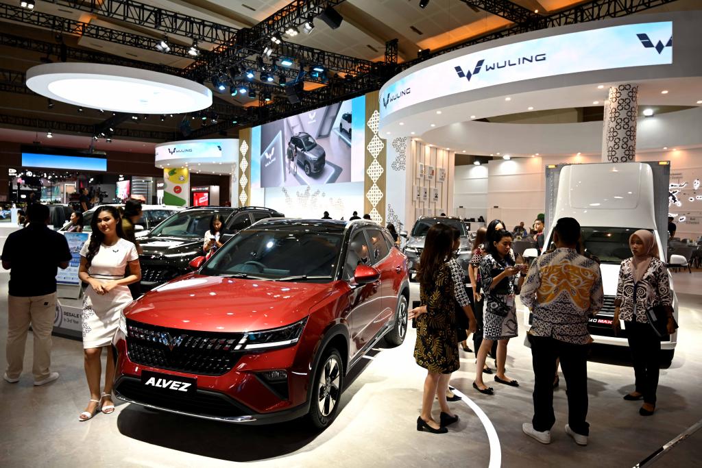 这是2月13日在雅加达的印尼国际车展现场拍摄的中国汽车品牌五菱展台。新华社发,阿贡摄