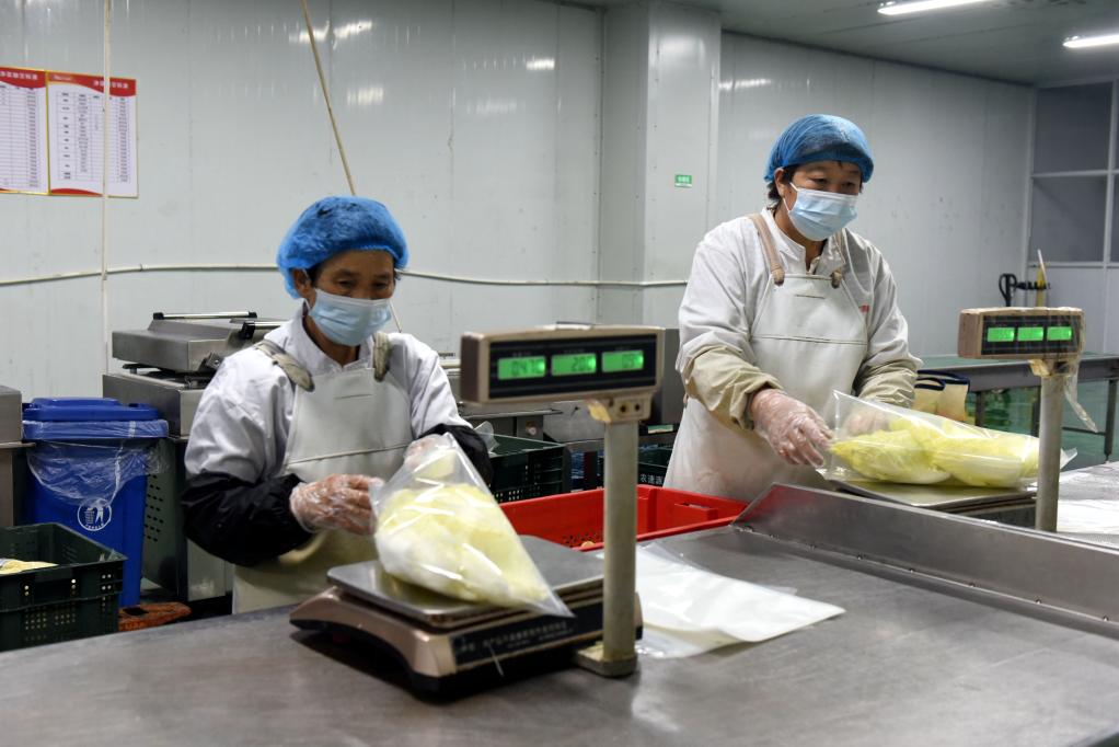 在河北农速源冷链物流有限公司的净菜生产线,工人将加工好的白菜装袋。新华社发(刘娟 摄)