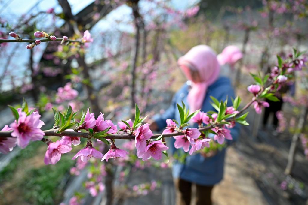 2月24日,在云南省文山壮族苗族自治州文山市马塘镇珍珠蜜桃基地,农民辛勤护理桃花。春回大地,各地抢抓农时,田间地头一片繁忙劳作的景象。新华社发(熊平祥摄)