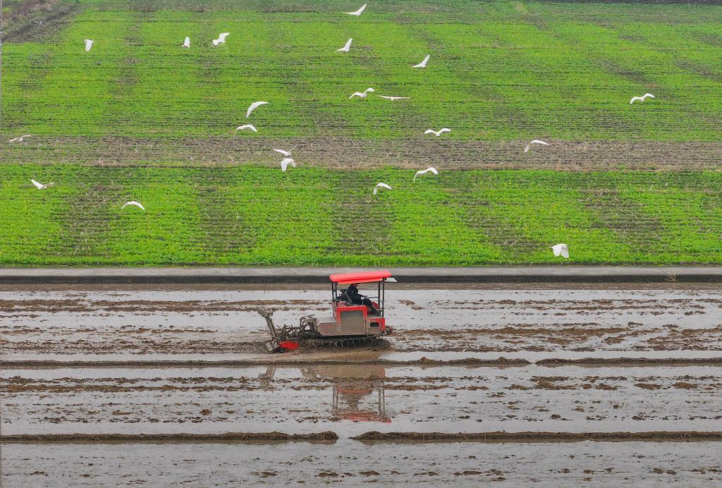 2月25日,在浙江省瑞安市马屿镇儒阳村,农机在田间犁地,白鹭低空而飞(无人机照片)。早春时节,各地农民抢抓农时,开展春耕、春管等农事活动,田间地头到处是一派人勤春早的忙碌景象。 新华社发(苏巧将摄)