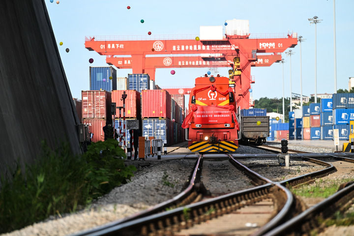 2024年6月26日,“韩国-连云港-中亚”国际多式联运班列从中哈连云港物流合作基地出发,驶往哈萨克斯坦、乌兹别克斯坦。班列运载的55个大柜此前于6月13日从韩国境内发出,经釜山港海运抵达连云港后转由铁路运输。新华社记者 季春鹏 摄