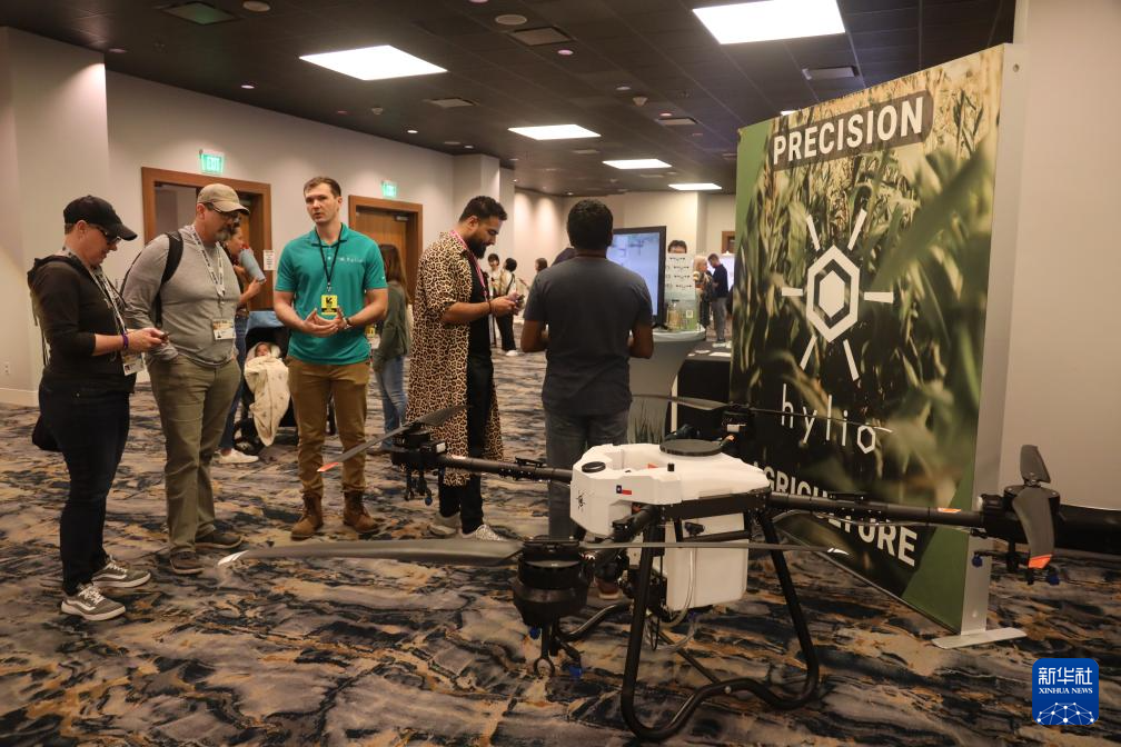 3月8日,在美国得克萨斯州奥斯汀举行的“西南偏南”大会和艺术节创新奖入围作品展示会上,参观者听取一款农用精密无人机技术介绍。新华社记者 徐剑梅 摄