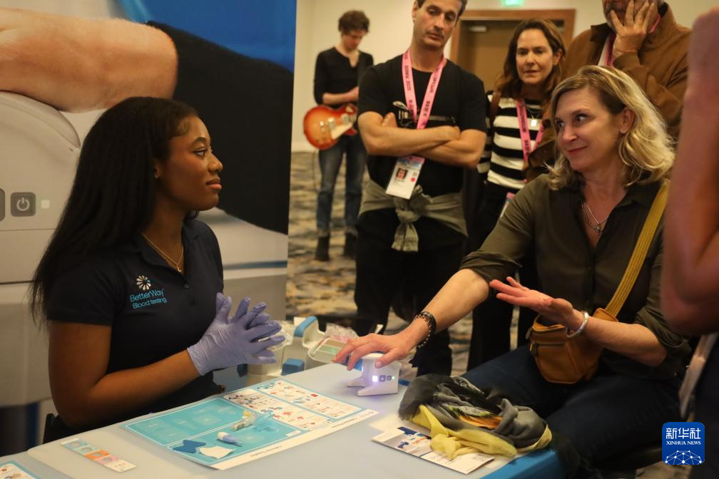 3月8日,在美国得克萨斯州奥斯汀举行的“西南偏南”大会和艺术节创新奖入围作品展示会上,参观者体验一种指尖采血检测产品。新华社记者 徐剑梅 摄