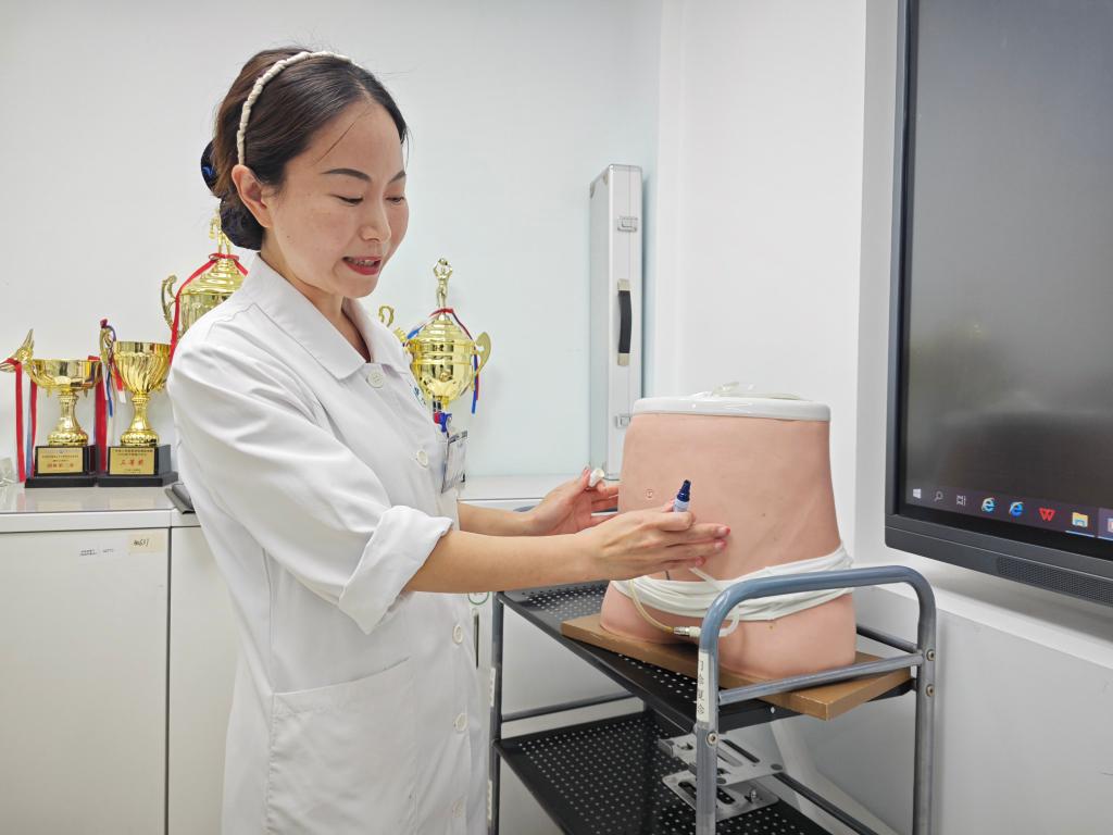曾以林使用腹膜透析护理操作模型进行示教。新华社记者 徐弘毅 摄