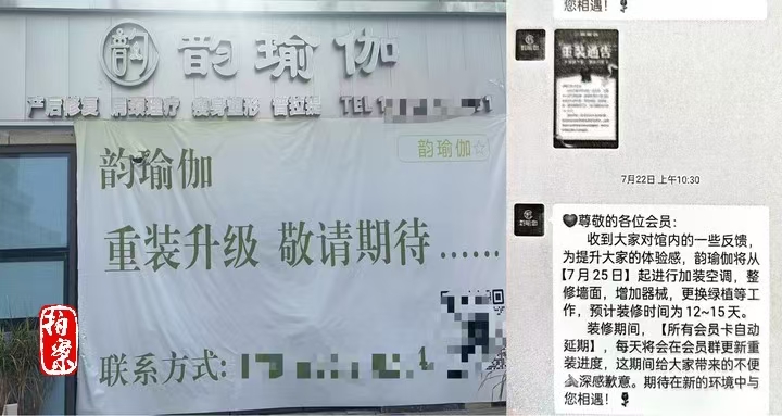 2024年7月,重庆渝北区一家名为“韵瑜伽”的健身馆,突然以“装修升级”为由关门歇业。本以为只是短暂停业,可顾客们等来的却是人去楼空的现实。