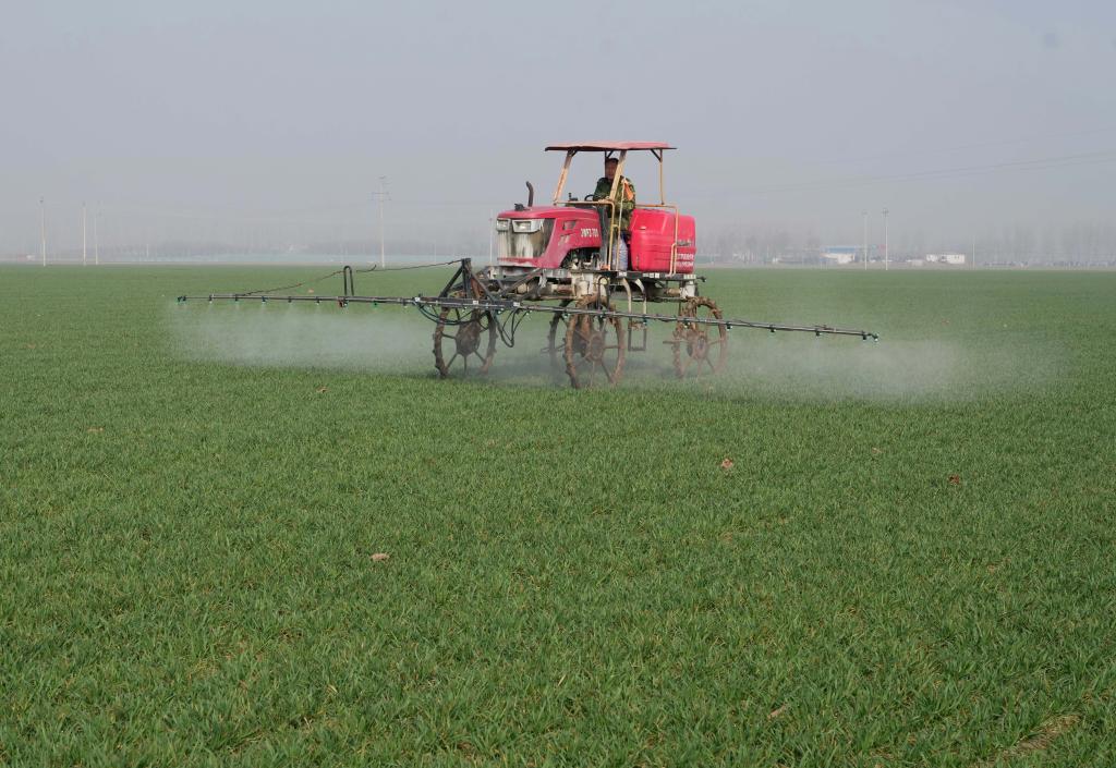 河北省邢台市南和区阎里乡阎里村的农民在驾驶农机给冬小麦喷洒杀菌剂。新华社发