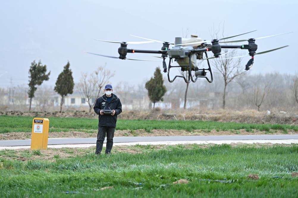 在山西省运城市盐湖区解州镇曲村,飞手操控无人机为麦田打药。新华社发