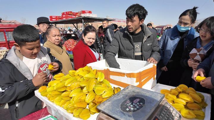 在和田市伊里其乡巴扎,村民们围聚杨桃摊前,认真挑选购买(2月23日摄)。新华每日电讯记者 白志强 摄