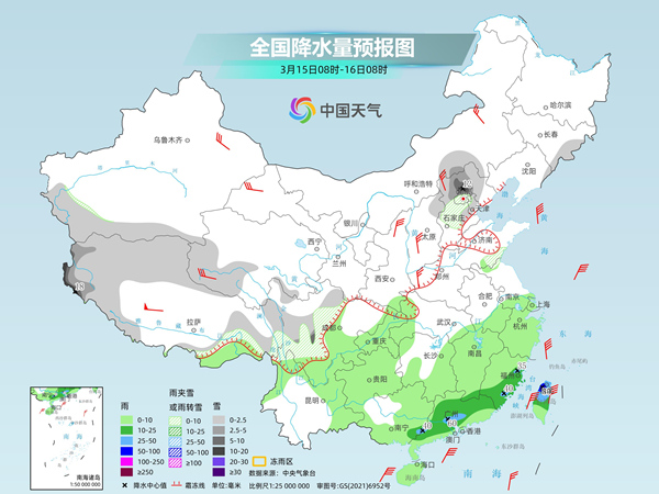 受冷暖空气共同影响,昨天中东部出现大范围雨雪,江南、华南多地降雨时还伴有强对流天气。监测显示,湖南南部、江西中南部、浙江南部、福建西部和北部、广西北部、广东北部及云南西北部等地部分地区出现大到暴雨,福建南平、广西河池、广东清远等地局地大暴雨;浙江南部、福建西部、广西北部、广东北部等地局地出现雷暴大风。山西北部、河北北部、内蒙古中部偏南地区等地部分地区出现中到大雪或雨夹雪,山西忻州、内蒙古乌兰察布等地局地暴雪。