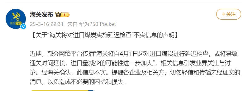 据“海关发布”官方微博消息,近期,部分网络平台传播“海关将自4月1日起对进口煤炭进行延迟检查,或将导致通关时间延长,进口量减少的可能性进一步加大”,相关信息引发业界关注与讨论。经海关确认,此信息不实。提醒各企业及相关方,切勿轻信和传播未经证实的消息,以免造成不必要的困扰和损失。