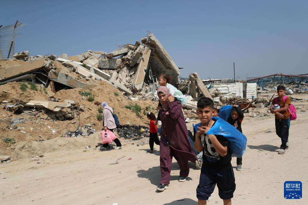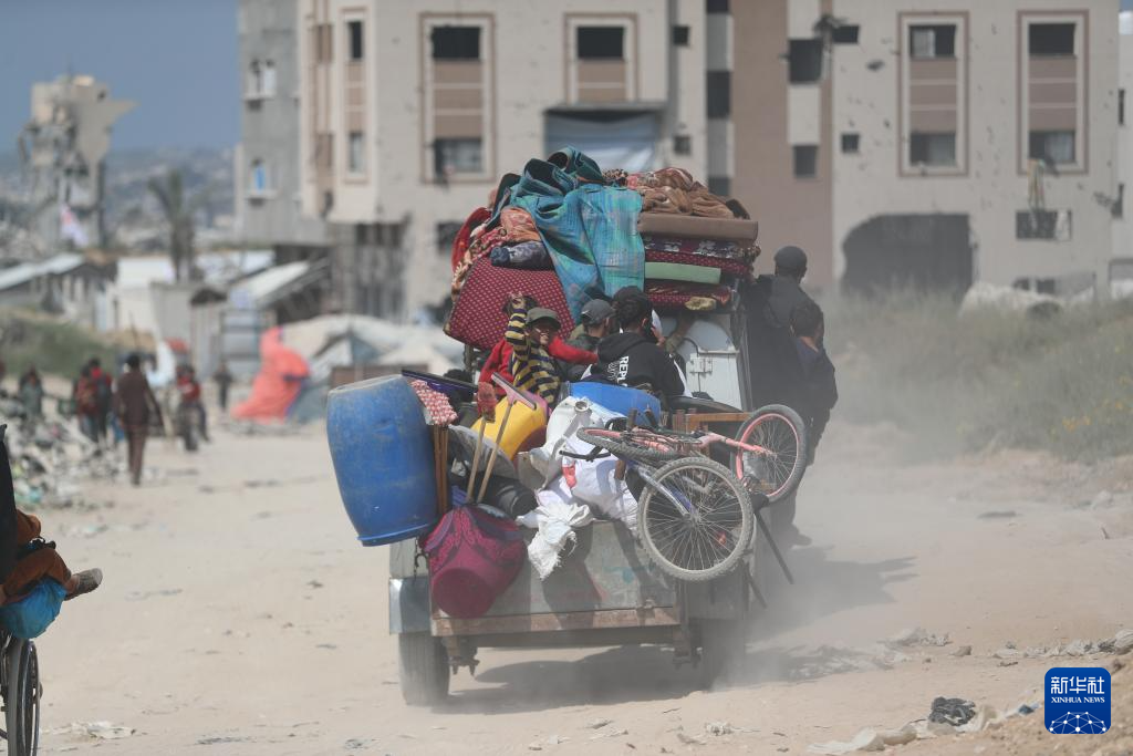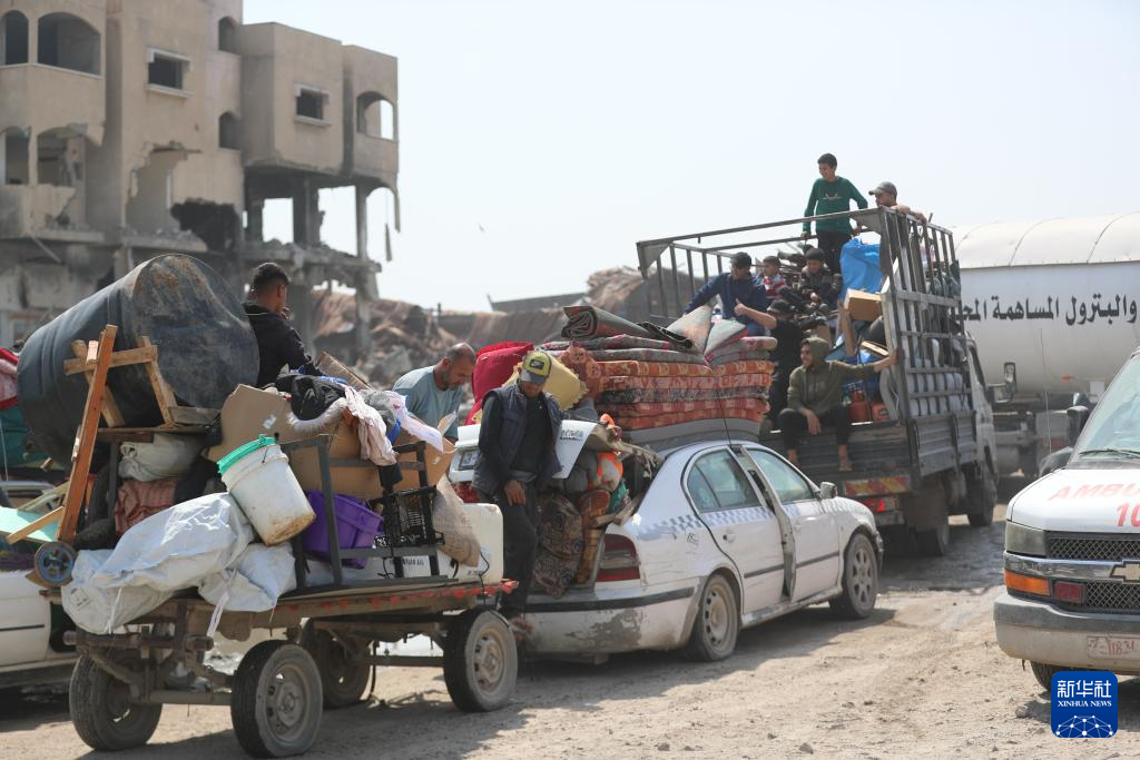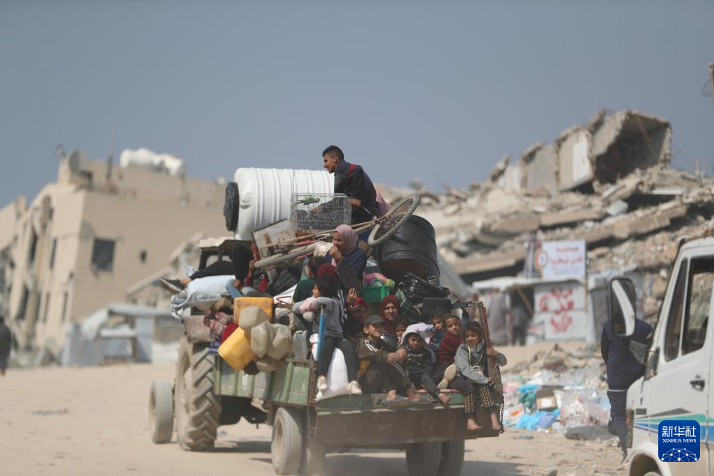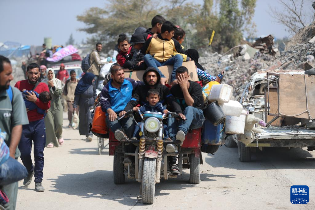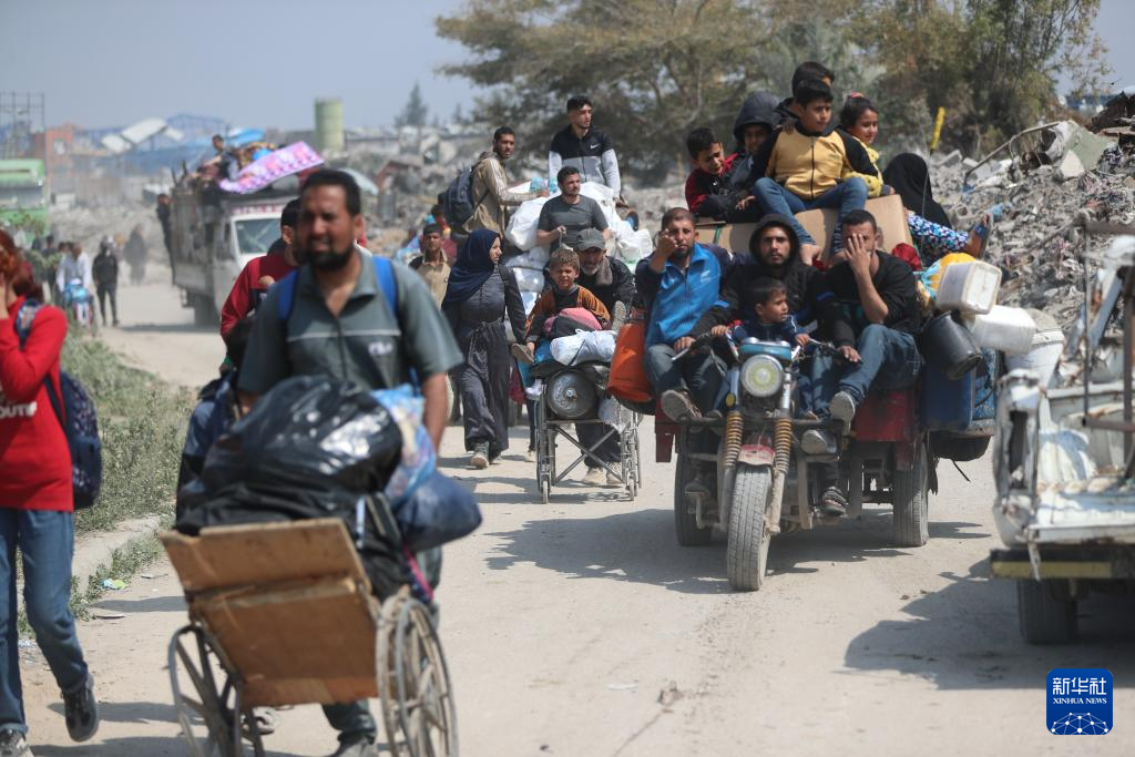 3月18日,被迫逃离加沙地带北部拜特哈嫩的巴勒斯坦民众经过加沙城。新华社发(马哈茂德·扎基摄)