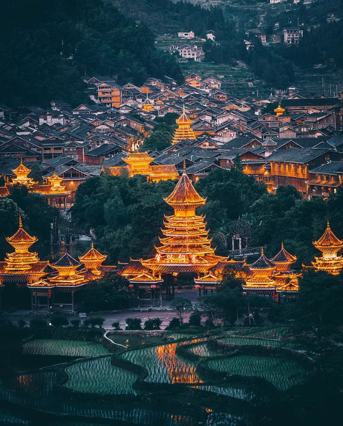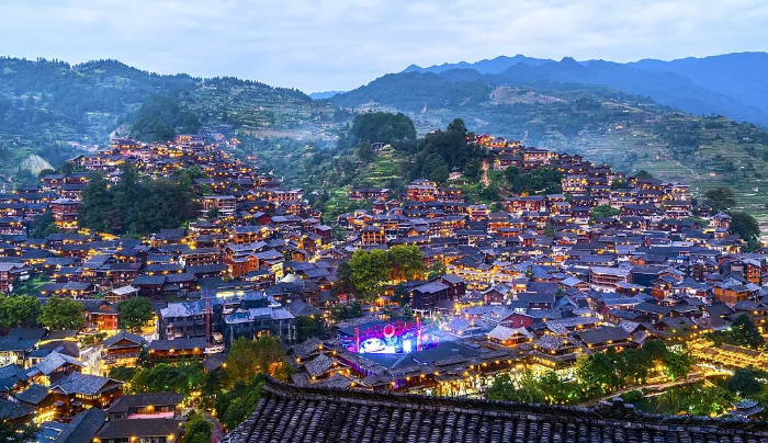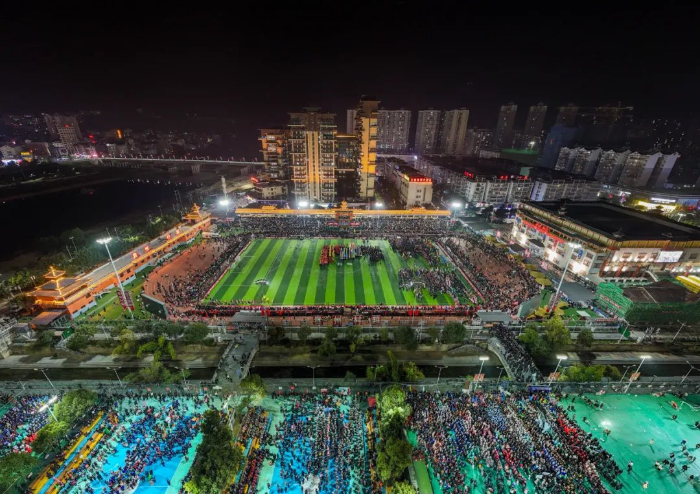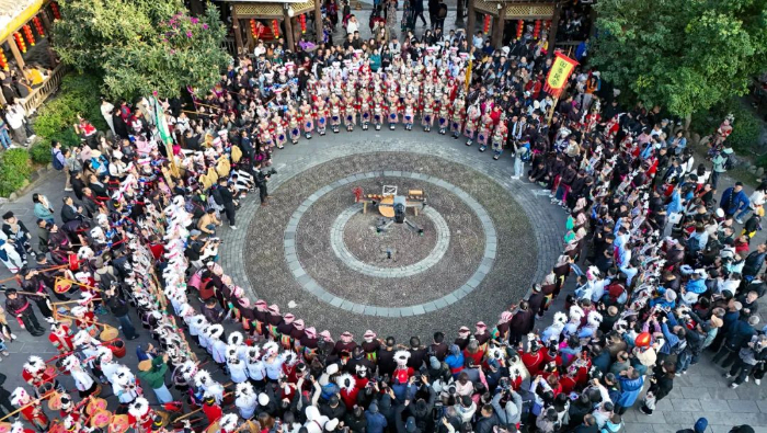 2024年11月30日,侗族群众在黎平县肇兴侗寨进行文艺表演(无人机照片),载歌载舞欢度侗年。新华社发(王纯亮摄)