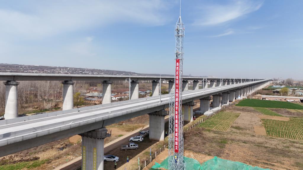 图为西十高铁全线首座通信铁塔。 (中铁一局供图)