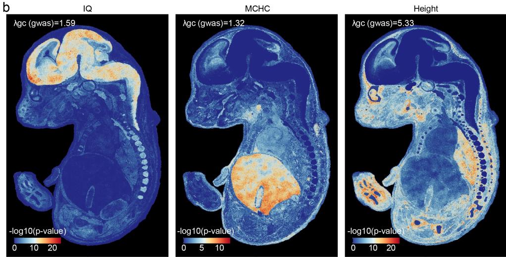 西湖大学团队绘制的小鼠胚胎细胞分布的“导航图”显示,与智商强关联的细胞,主要分布在大脑(左),与血红蛋白浓度相关的细胞,集中在肝脏(中),而与身高最相关的细胞,则分布在软骨中(右)。(图片由西湖大学生命科学学院教授杨剑团队提供)