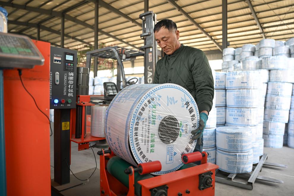 图为工人在内蒙古兴安盟扎赉特旗内蒙古鑫嘉立铭新材料科技有限公司生产车间打包滴灌带。新华社记者 贝赫 摄