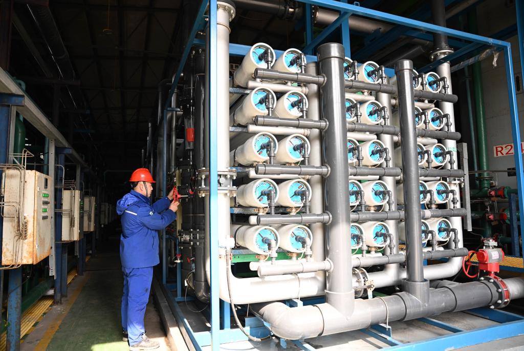图为工人在内蒙古兴安盟经济技术开发区博源化学有限公司除盐水厂房操作超滤反渗透装置。新华社记者 贝赫 摄