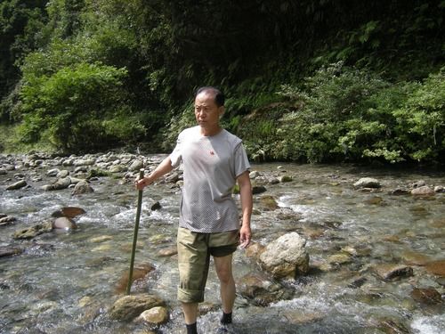 2015年,王新法在薛家村的河道里探测,准备为村里修桥。常德市宣传部供图。