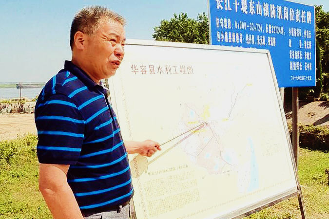2017年汛期,张志红在长江大堤上讲解水情(吴巍伟 摄)