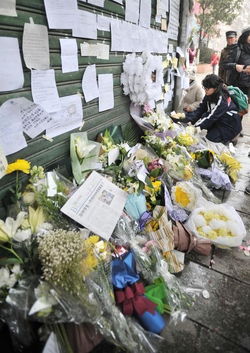12年前的一次下班路上,我看到长沙市一中的小报刊亭前聚集了很多人,便好奇地跑过去看。报刊亭被康乃馨、白玫瑰、向日葵等簇拥,人群肃穆,有的蹲下放置鲜花,有的靠着墙在卡片上写字,有的焦急向旁人打听,问答之间,脸上从疑惑变成悲伤。