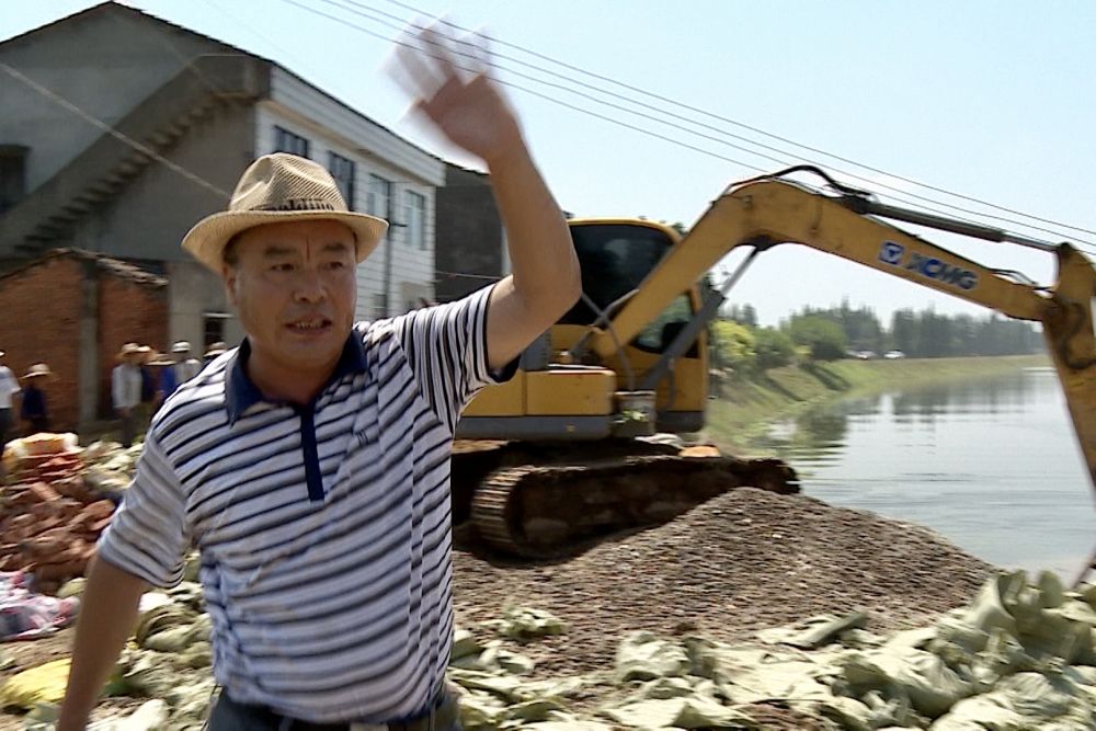 2016年7月10日,张志红在新华垸华容河溃堤现场指挥卡车“沉车裹头”抢险(吴巍伟 摄)