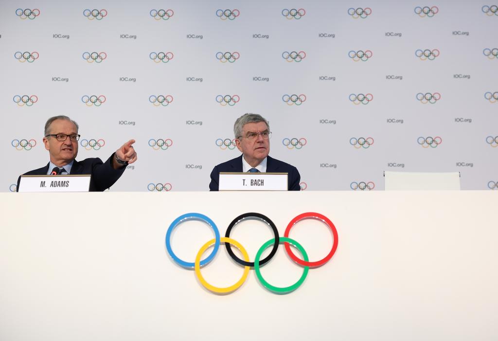 3月21日,国际奥委会主席巴赫(右)在发布会上。新华社记者 曹灿 摄