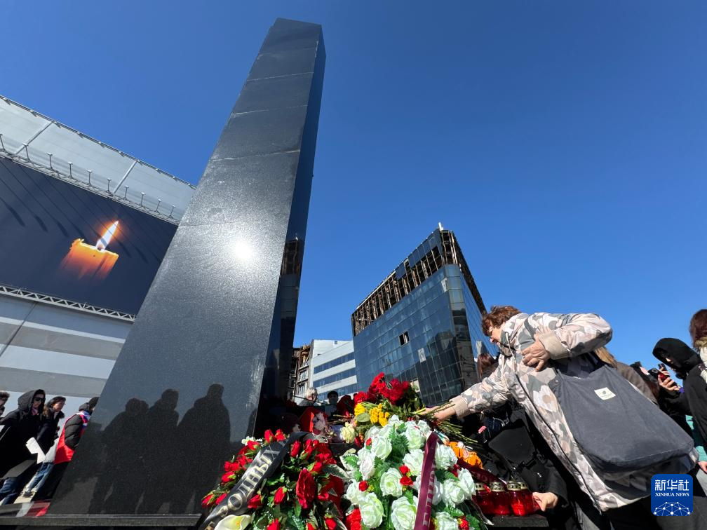 3月22日,在俄罗斯首都莫斯科近郊,人们向“克罗库斯城”音乐厅恐袭事件遇难者纪念碑献花。新华社发(亚历山大摄)