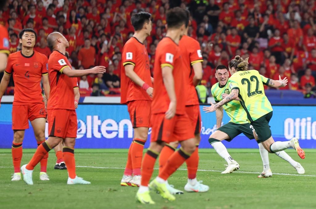 本场比赛,杭州奥体中心体育场涌入了超7万名球迷,不过现场巨大的声浪并没能给国足带来好运。第16分钟,澳大利亚队杰克逊·欧文得球后杀入禁区,黄政宇在防守时不慎滑倒,前者起脚兜射破门,中国队0:1落后。