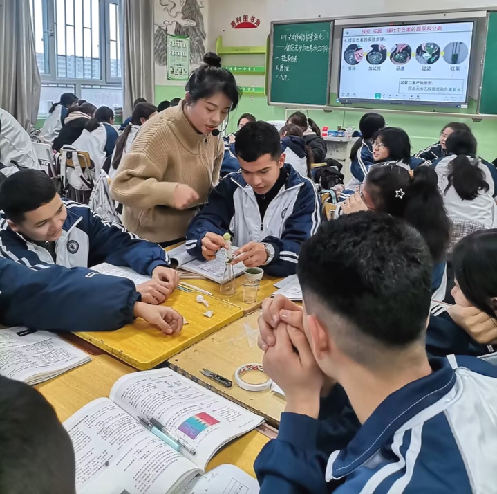 同样来自中国农业大学的邓子萱现在是这所学校的高二化学老师,她清楚地记得第一次上课点名时,自己因紧张心怦怦跳,以及学生们陌生又好奇的眼神。
