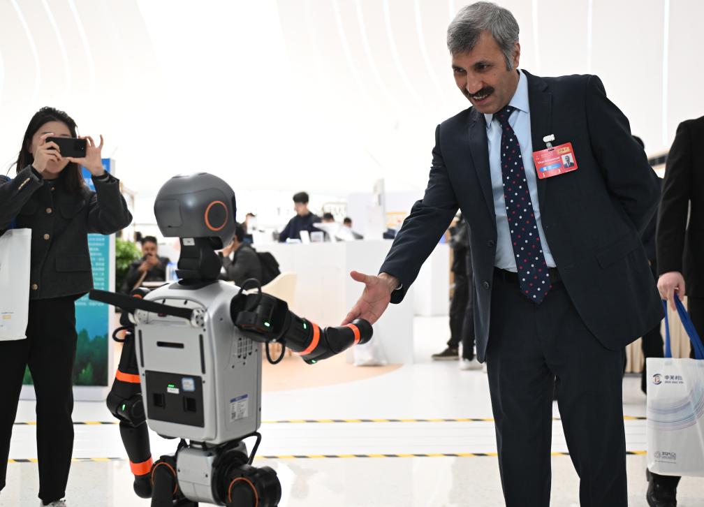 3月27日,与会嘉宾与一款加速T1机器人握手。新华社记者 张晨霖 摄