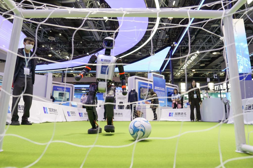 北京清飞科技有限公司的“妮娅”仿生人形机器人通过情绪识别算法与观众对话;北京加速进化科技有限公司(以下简称“加速进化”)的“加速 T1”不仅是开幕式舞蹈演员,还是常设展足球赛运动员;乐聚通研(北京)机器人技术有限公司(以下简称“乐聚通研”)的人形机器人“夸父”承担着迎宾工作,为公众解答疑问、提供讲解和指引服务等。