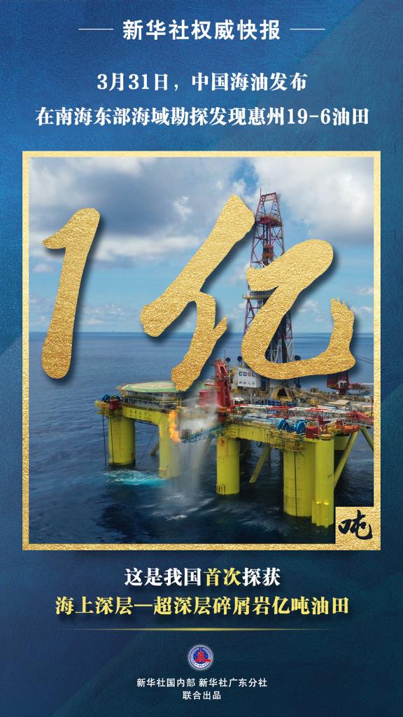 新华社深圳3月31日电(记者印朋)3月31日,中国海油发布消息,我国在南海东部海域勘探发现惠州19-6亿吨级油田。这是我国首次探获海上深层—超深层碎屑岩大型整装油田,展示出我国近海深层—超深层领域油气勘探潜力。