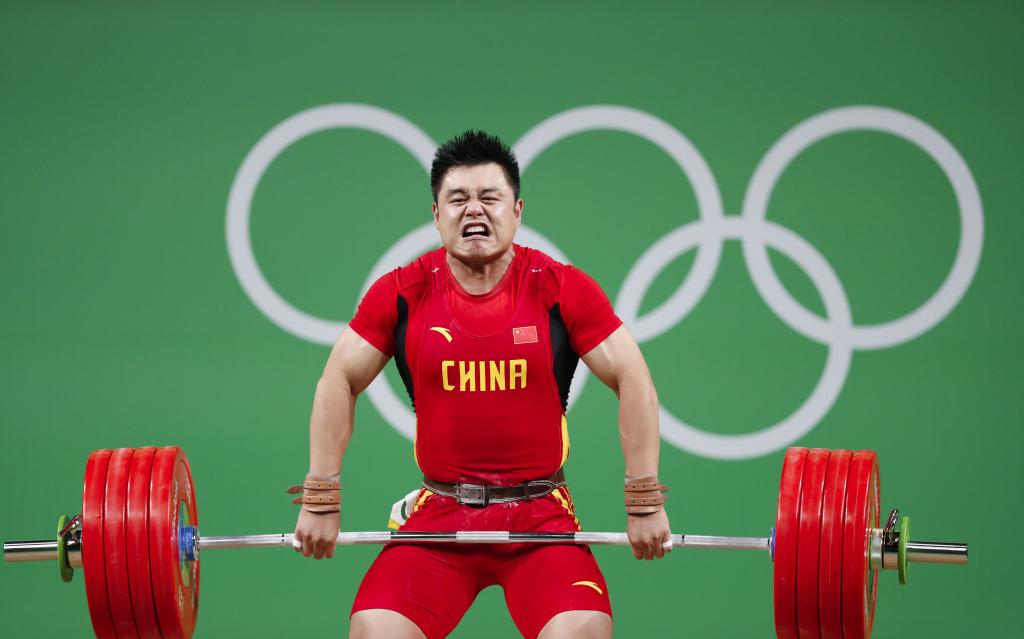 2016年8月15日,中国选手杨哲在里约奥运会举重男子105公斤级比赛中。新华社记者 韩岩 摄
