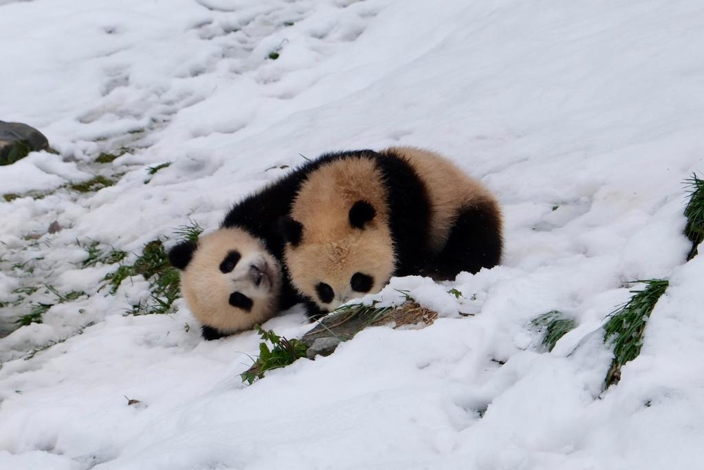 4月1日,中国大熊猫保护研究中心卧龙神树坪基地的两只小熊猫正在雪中玩耍。新华社记者 张雅雯 摄