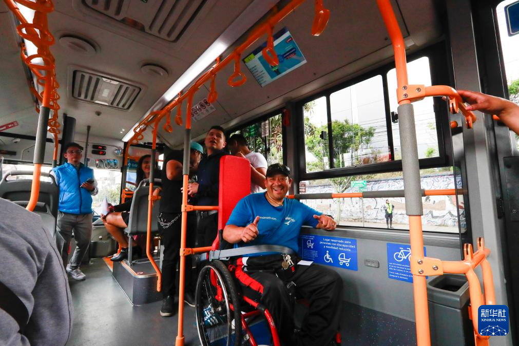 3月31日,在厄瓜多尔首都基多,市民体验宇通双源无轨电车。新华社发(里卡多·兰德塔摄)