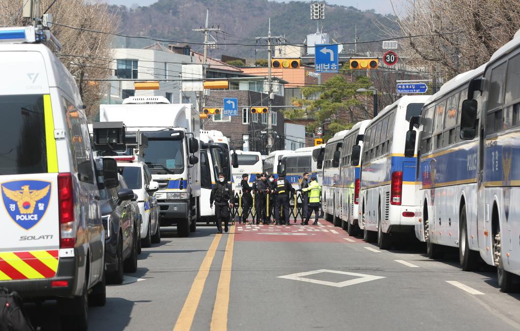 4月3日,在韩国首尔,警察在韩国宪法法院附近进行交通管制。新华社记者姚琪琳摄