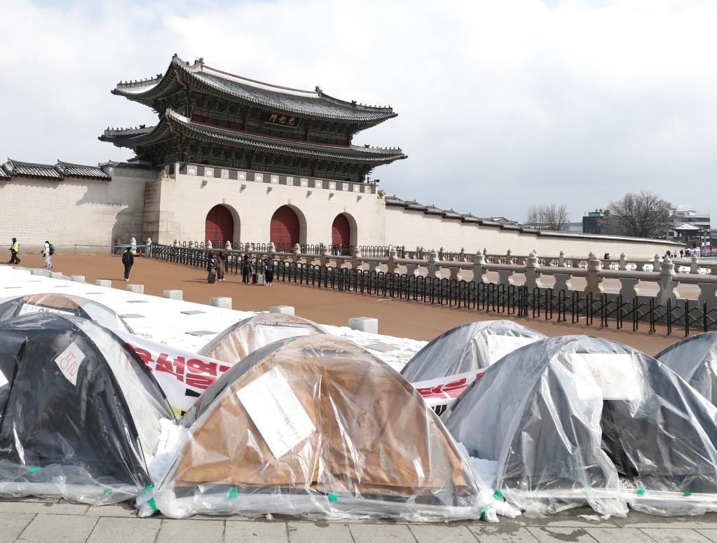 3月18日,在韩国首尔,支持弹劾尹锡悦的市民在光化门广场前搭建帐篷,参加静坐示威要求罢免尹锡悦。新华社记者姚琪琳摄