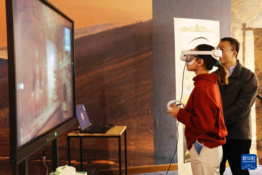 4月3日,在蒙古国首都乌兰巴托,嘉宾在活动上体验“寻境敦煌——数字敦煌沉浸展”。新华社发(苏力雅摄)